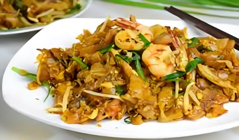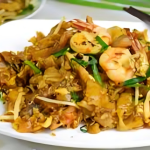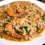 Kuey Teow cooked together with soya sauce, Squid, chili paste, egg, prawn, bean sprout, chives and choices dry or gravy style. Served with cucumber, tomato, lettuce and crackers