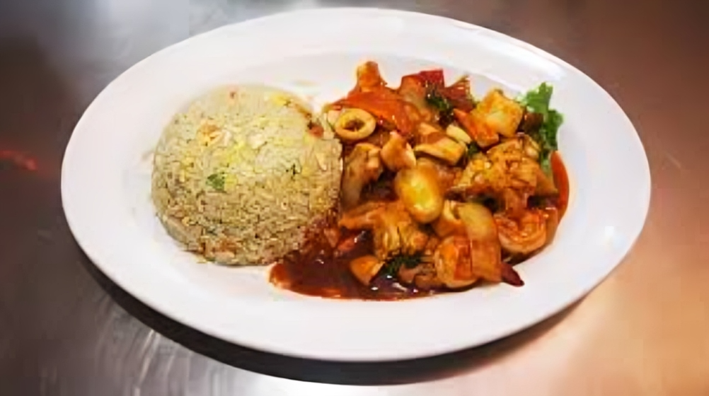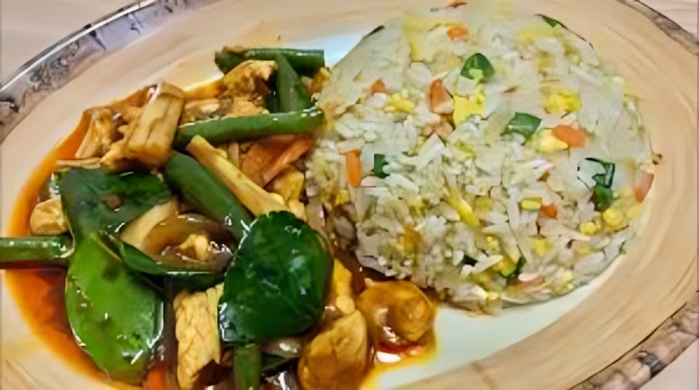 Steamed rice serve with spicy chicken cooked together with soya sauce, lime leaf, lemon grass, chili paste, mix vegetables, cucumber, tomato, lettuce and crackers