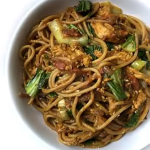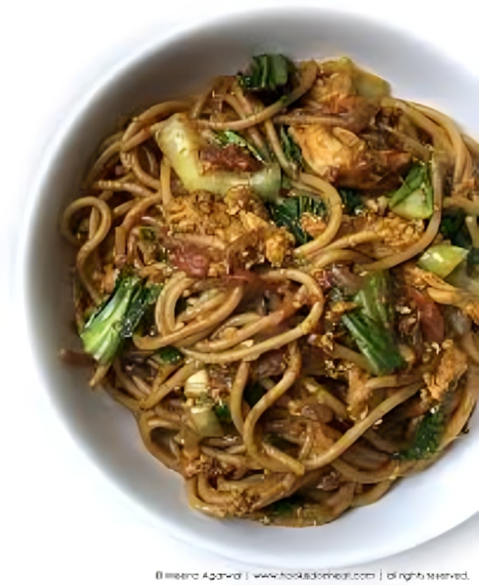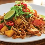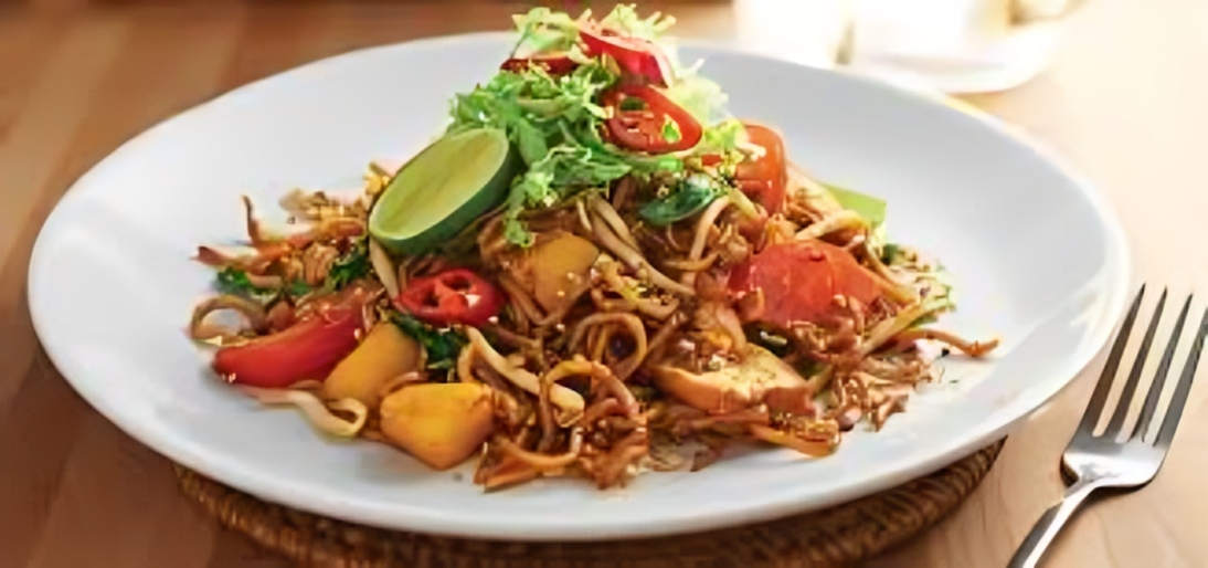Yellow mee cook together with soya sauce, egg bean , curd, tomato cube, minced chicken, prawn, chili pasta, mix vegetable served with lime, cucumber, tomato, lettuce , and crackers