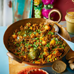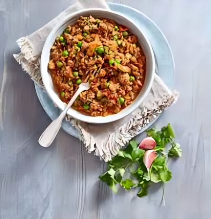 Ground lamb cooked with green peas, tomatoes and 0nions