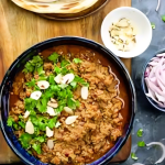 “Savor the rich flavors of our Lamb Qeema, a traditional Indian delicacy where finely minced lamb is simmered with aromatic spices, onions, tomatoes, and green peas. Garnished with fresh cilantro, this hearty dish is perfect with warm naan or steamed rice, promising a taste of authentic Indian comfort.”